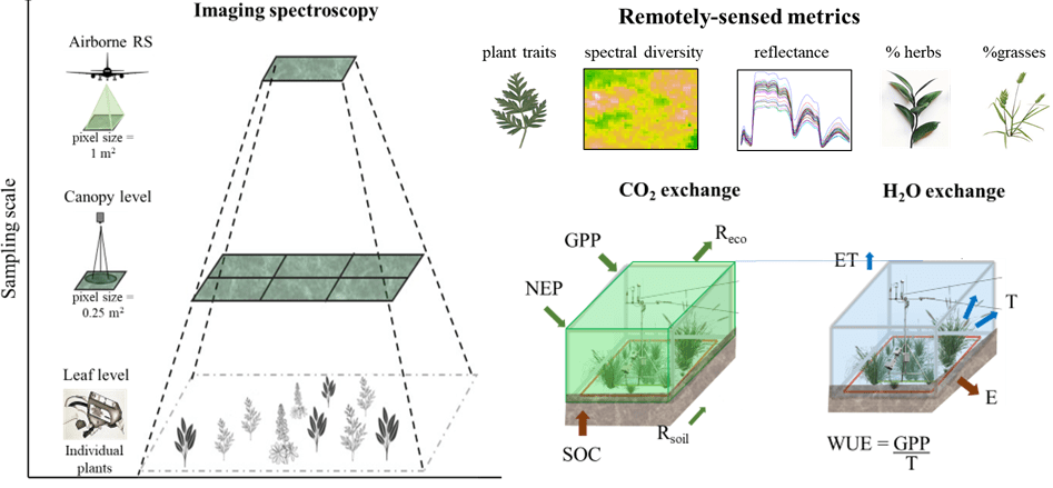 Vegetation properties at local and global scales are important predictors of the exchange of water and carbon in terrestrial ecosystems. However, quantifying vegetation change across space and time continues to be challenging with field-based methods. Remote sensing overcome this challenge by mapping the continuous of vegetation change across large enviromental gradients, but it remains unclear what is the appropriate scale to quantify vegetation properties using remote sensing, and how the sampling scale affects our ability to predict terrestrial ecosystem function. This project focuses on i) evaluating whether diversity metrics derived from imaging spectroscopy predict carbon and water fluxes, ii) how this predictability changes across sampling scales, and iii) examine the relative importance of abiotic conditions vs. remotely-sensed diversity metrics to predict ecosystem fluxes.